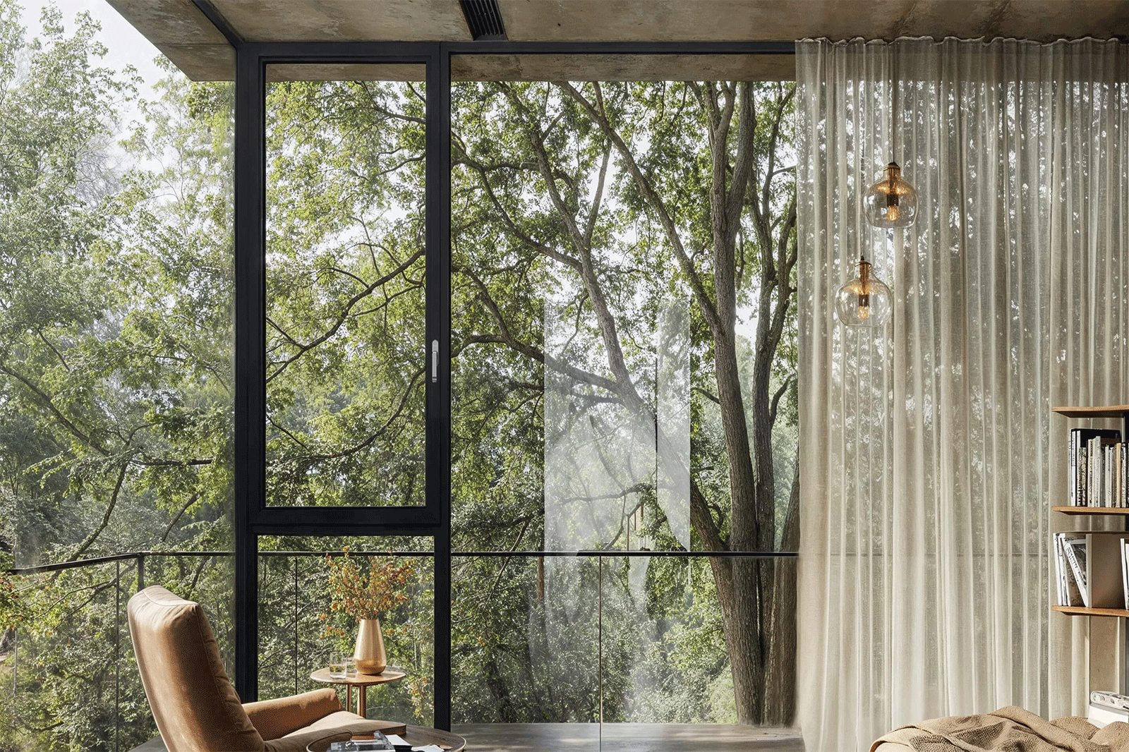 框扇室內(nèi)外平齊設(shè)計(jì),線條簡約利落,立面效果簡潔平整。窗扇開啟狀態(tài),開啟扇與建筑外立面平行。